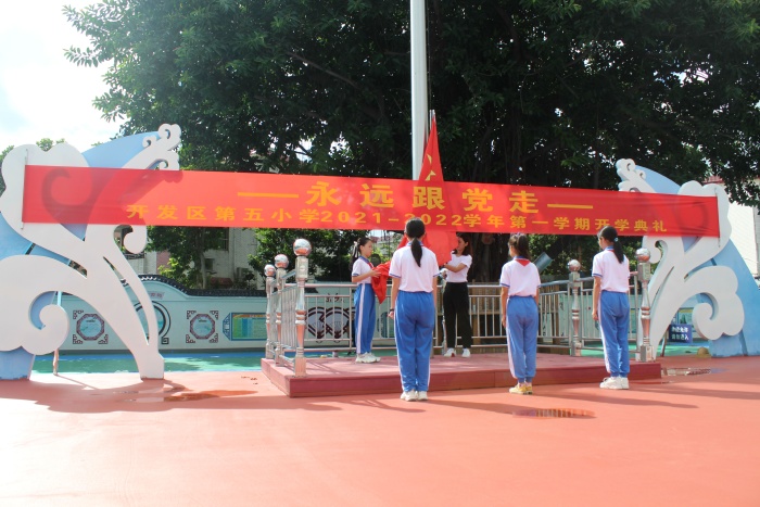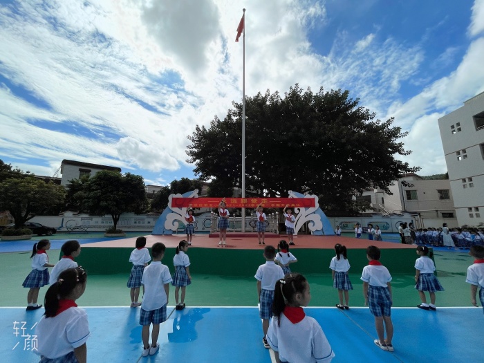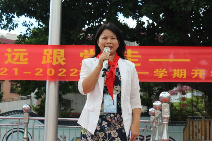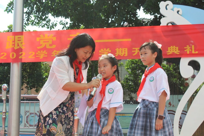 活动在庄严的升旗仪式中拉开序幕。全体少先队员敬队礼、唱国歌,嘹亮的歌声响彻校园。接着,党支总书记、少工委主任胡冬梅结合《贺军科、郑富芝同志在全国少工委第八届二次全会上讲话的全会工作报告》的讲话精神以及工作报告内容,为全体师生作新学期致辞。她表示:第五小学校少工委将继续以《意见》为指引,深入学习贯彻习近平总书记关于少年儿童及少先队工作的重要论述,抓住新时代少先队工作的历史机遇,深化少先队改革。全体辅导员要聚焦少年儿童政治启蒙和价值观塑造,厚植红色基因,传承红色精神,为培养社会主义的建设者和接班人不断努力奋斗!随后,胡校长以互动的方式跟全体学生分享东京奥运会发生的一些感人事迹。广东湛江的全红婵,中山古镇的苏炳添等运动健儿的事迹,并以此为契机,寄语全体少先队员们以这些运动员为榜样,学习他们不怕苦不怕累的高尚品质,好好学习,未来为祖国做贡献。