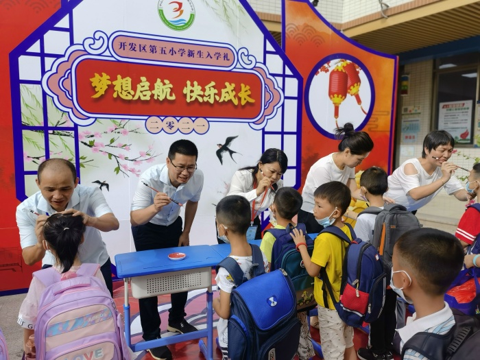 29日早上,第五小学的老师和少先队队干们早早等在校门口迎接新生的到来。一年级的孩子们分组在大队委的陪伴下,穿过“知礼门”,走过“六礼长廊”,来到了“朱砂启智”,早已等候在此的学校行政用朱砂在新同学额头正中点上红痣,寓意着孩子们从此眼明心明。紧接着来到“击鼓明志”的环节,老师们带领着孩子击鼓三声,以示孩子们从今启蒙,立下远大志向,伴随着鼓声,孩子们纷纷大声地说出自己的志向。最后,孩子在队委们带领下来到教室门口的“梦想树”前,留下了自己的手指小印后,陆续进入教室有序就坐。