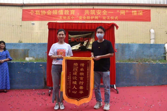 随后,火炬区教育事务指导中心主任钟海清、火炬区市场监督管理局副局长尹俐玲、城东社区党委书记阮金城、火炬区个私协会会长阮锦活、第五小学校长胡冬梅、副校长崔洋共同为“爱心防护网”进行揭牌。学校对赞助此项工程的单位和个人赠送了锦旗和纪念品。