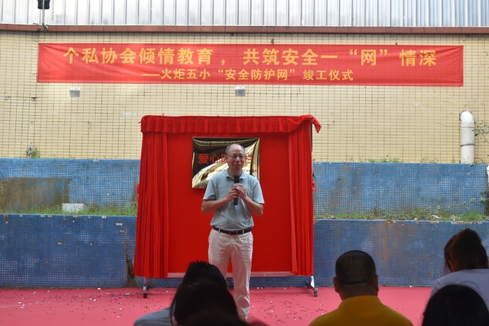 活动最后,区教育事务指导中心主任钟海清进行了活动总结讲话,他表示:安全防护网的安装保障了五小师生的安全,相信五小教育教学工作在个私协会的大力支持下一定会越来越好。