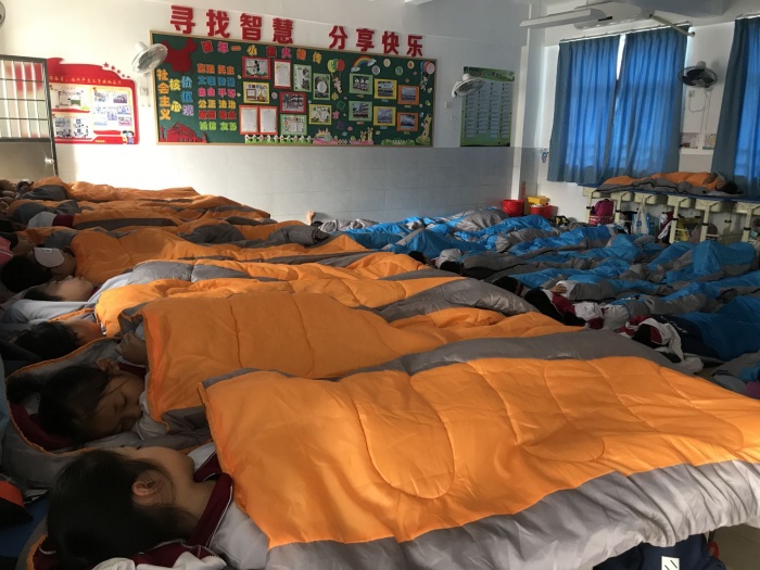 为积极响应学校推行“躺平”午休的号召,全体班主任老师也立即有序高效的采取行动。各个班级在班主任老师的带领下,采用几张桌子拼成一张“床”和在地上铺垫子的“床”这两种“午休床”的方式,自主制定午休管理制度,从睡前桌椅、垫子、鞋子的摆放整齐、卫生干净整洁,到睡后午休用品的迅速整理、桌椅快速归位,井然有序。