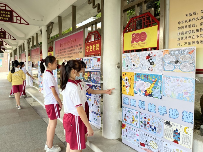 在各项科技活动的开展中,同学们都积极自主,放飞想象。在“科技小发明小制作”的活动中,一至六年级学生取灵感于生活,脑筋动一动,废物即摇身一变成精致的航天模型、宇宙模型、机器人模型等。在“科学知识竞赛”中,三至六年级派出的参赛代表都旗鼓相当,答题如龙争虎斗。经过激烈的角逐,分别由三2班、四3班、五7班、六3班获得知识竞赛的特等奖。基于一、二年级学生的年龄特点,科学老师贴心地以“创意撕纸比赛”和“喷气小车团体”取代难度较大的知识竞赛,孩子们都超级喜欢!孩子们还超级喜欢科学老师精心挑选以“自然生命”为主题的“科普大电影”。无论是一年级的《蓝色星球》,还是六年级的《流浪地球》,都旨在提高学生保护环境的意识,让学生懂得爱护动植物与珍爱生命,加入保护地球行列。最吸引眼球的是以“神舟十三号航天员太空出差六个月,远征星辰大海后返回地球”为主题的科学手抄报。展示长廊后,经过的老师与学生都不由自主地驻足观看。