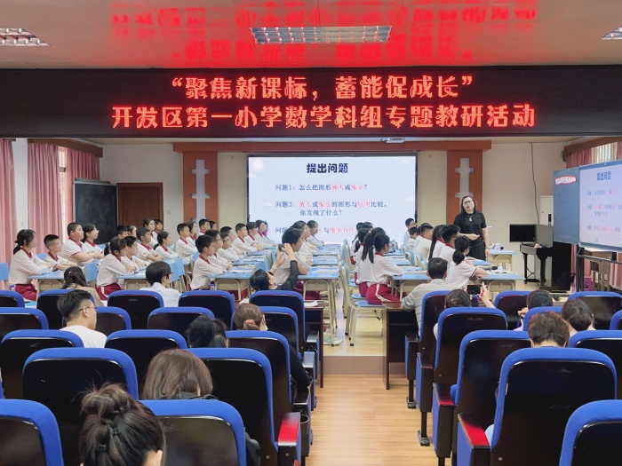 为加深数学教师对2022版数学课程标准的理解,深刻领会新课程标准内涵,4月10日下午,开发区第一小学在学校电教室开展以“聚焦新课标,蓄能促成长”为主题的数学专题教研活动。本次活动邀请中山市小学数学教研员刘燕校长到场指导,博文学校、开发区第二小学的数学教师代表参与了此次活动。