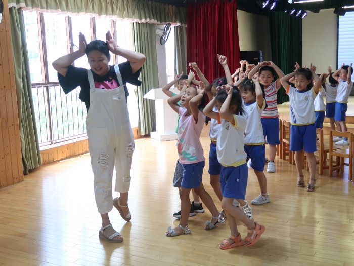 王萍书记以绘本故事《鳄鱼爱上长颈鹿》为蓝本,沿用了开发区第一幼儿园戏剧教育特色课程,亲自原创戏剧活动《鳄鱼爱上长颈鹿》,通过热身游戏、手偶讲故事、小组表演等戏剧策略与方法,让幼儿了解了故事内容、掌握了鳄鱼与长颈鹿的外形特征,并通过肢体演绎,大胆表现与表征鳄鱼与长颈鹿的形象特点,积极调动思维、发挥想象力,帮助鳄鱼想办法,与长颈鹿交朋友。