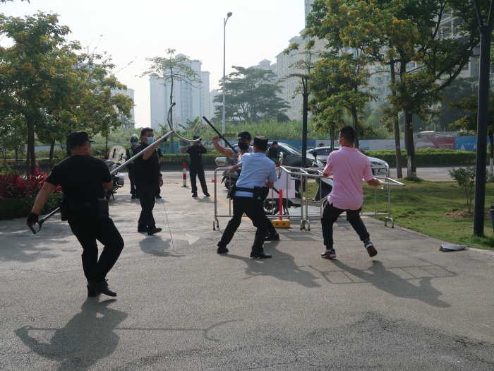 此次演练在全园幼儿和教师中展开,在驻校民警协助指导下,由安保公司人员假扮“歹徒”并手持凶器强行翻墙进入幼儿园。幼儿园保安队发现异常情况后立即启动报警系统,并采取有针对性防暴力事件的各种措施,拿起钢叉、铁棍等勇敢地与“歹徒”进行搏斗。各班老师组织正在操场上游戏的小朋友快速有序地就近疏散、避险。最后“歹徒”在教师及保安人员的齐心协力下被成功制服,此次演练进行得十分顺利。演练后各班老师在安抚幼儿情绪的同时对幼儿进行了安全教育。