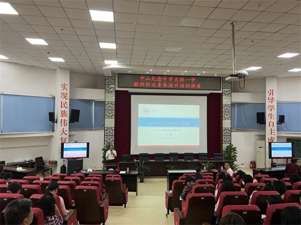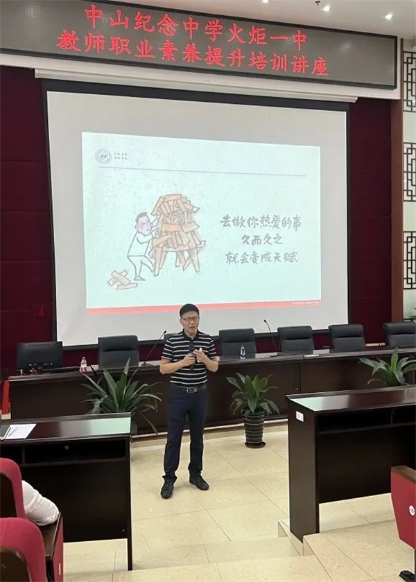 塑造教师的优秀品格、提升纪中火炬一中教师职业素养,赋能教师专业化发展,5月9日下午,特别邀请中山市教育教研室副主任周曙来纪中火炬一中开设题为《做学生喜欢的好老师》的教师职业素养提升培训讲座。中山纪念中学教育集团托管的浪网中学教师一同到现场聆听了讲座。本次讲座由纪中火炬一中党总支书记、副校长程炜敏主持。