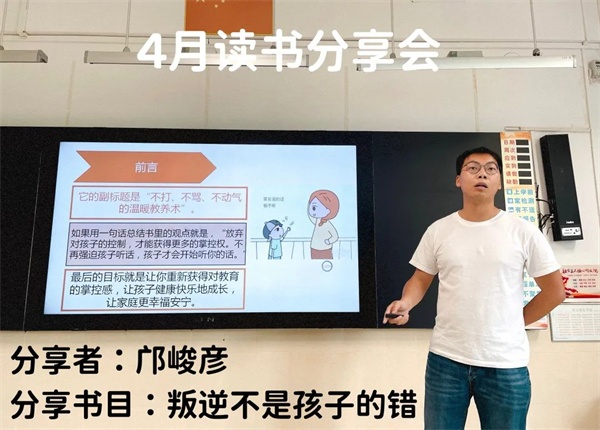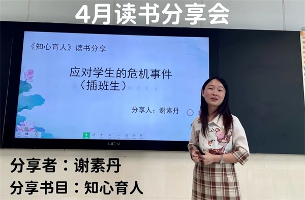 李盈姣老师分享了阅读《知心育人》全书的感受。阅读这本书,她明白了“危机事件≠心理问题”,学生在日常学习和生活中会遇到危机事件,自己需要做到了解多一点,关注多一点,关爱多一点,空间留一点。在家校合作方面,要遵循“一切为了孩子”的原则,主动取得家长更好地配合。