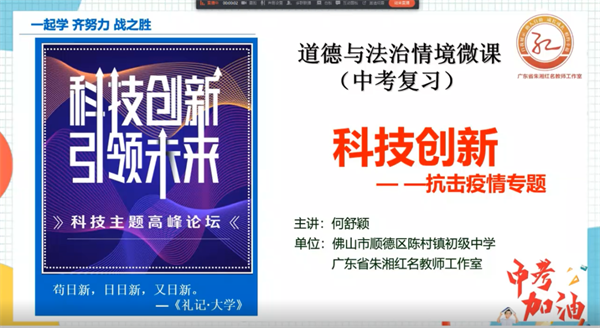 最后,两校思政教师共同在线观摩了何舒颖老师主讲的微课《科技创新》,何舒颖老师于2016年获得广东省思想品德和道德与法治优质课比赛活动现场授课、说课及综合总分“特等奖”。