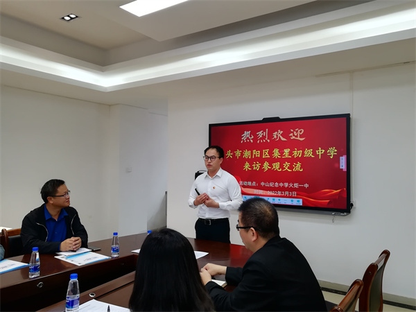 为落实世行贷款项目,推进全省义务教育均衡优质标准化发展,中山纪念中学火炬一中作为支援学校,与受援学校汕头市潮阳区集星初级中学结对,指导结对学校开展帮扶工作。3月3日,汕头市潮阳区集星初中行政一行6人,在校长翁松标的带领下,到火炬一中就接下来的帮扶工作进行深入交流。