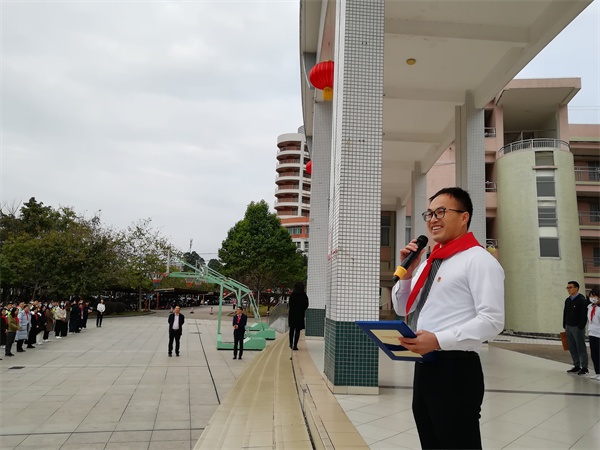 2月14日,中山纪念中学火炬一中新学期第一周升旗仪式如期举行。仪式由初二(11)班贾曦雯同学主持。