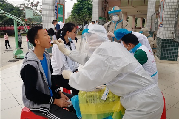 火炬区一中将自主文化广场定为检测场地,确保通风良好。受测学生从学校南门进入广场,所有学生、工作人员进校前需做体温筛查和查验粤康码,无粤康码、非绿码人员及体温异常不可入校。检测时要出示身份证或学生证(学籍号),需戴口罩。学校安排全程录像。现场共分15列纵队检测,至下午4时左右,市疾控中心的工作人员完成全部检测任务。