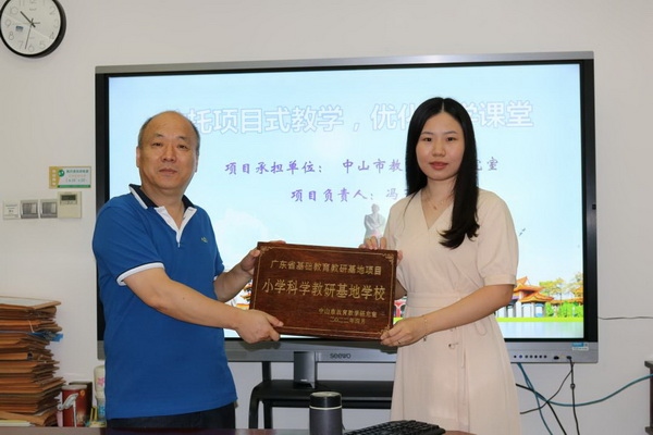 在授牌仪式上,中山市教育教学研究室主任何晋中为广东省小学科学学科教研基地学校授牌。香晖园小学荣幸地入选为其中一所基地学校,柳桦老师作为代表上台接受授牌。