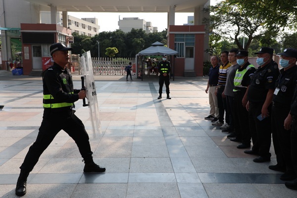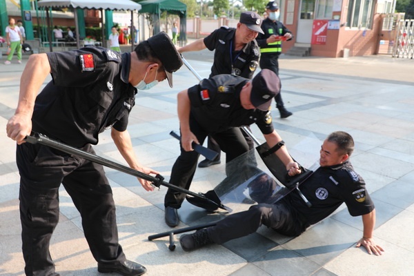 党员教师队伍和安保队伍分组就模拟有暴徒袭击学校的情境展开演练。只见“暴徒”手拿凶器,试图闯进学校攻击师生,教师和安保人员齐心协力,使用防暴棍、防暴盾牌等器械将“暴徒”制服。