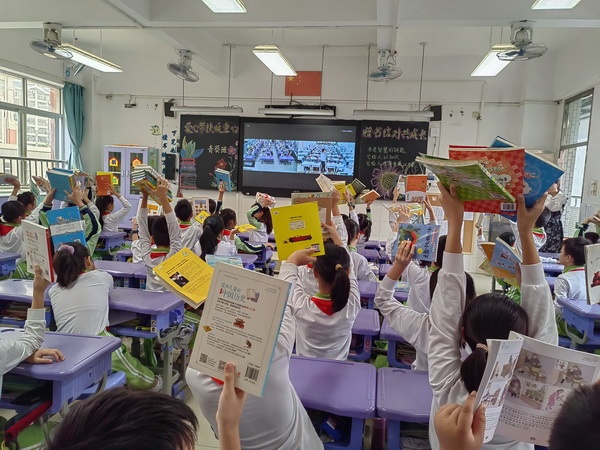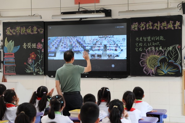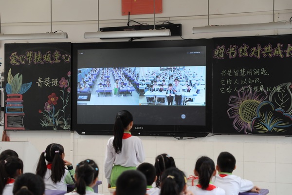 交流结束后,四(5)青葵班的刘梓萱同学还分享了自己的阅读历程与收获,推荐了自己喜欢阅读的书目,希望小伙伴们能在阅读中找到快乐,在书中找到生命发展的力量。赠书仪式开始了,该班全体同学纷纷高举自己捐赠的书籍,展示给远方小伙伴们看,希望通过网络传递出自己那一份诚挚的心意。