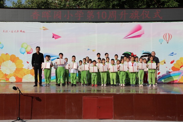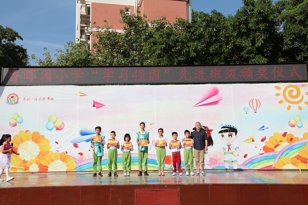 接着是“荣誉时刻”环节。叶建林老师带领竹笛队演奏作品《扬鞭催马运粮忙》荣获全球音乐教育联盟广东赛区“第一届青少年艺术展演”金奖,作品《新编进行曲》荣获银奖。同时,作品《扬鞭催马运粮忙》还在晋级赛中荣获二等奖。欧阳祝棣校长和刘裕副校长为这两个作品的参赛选手颁发了证书并与他们合影留念。仪式上还颁发了“学习强国”学习先进奖。