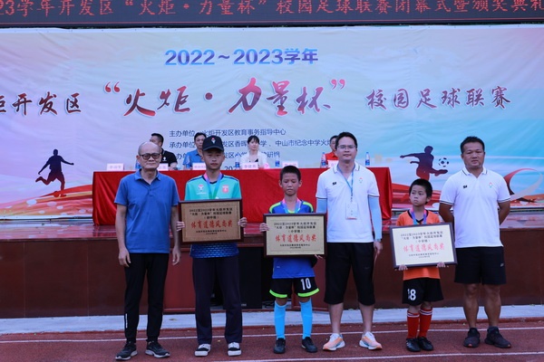 为增强学生体质,提升校园球类运动氛围,在工作人员的精心组织下,在全体运动员的共同努力下,2022-2023学年火炬开发区“火炬力量杯”校园足球联赛顺利落下帷幕。9月28日,在香晖园小学操场举行了隆重的闭幕式暨颁奖典礼。火炬开发区文体教育局副局长李建英,火炬开发区教育事务指导中心教研室股长詹必国,火炬开发区教育事务指导中心安全体卫专干吴计亮,中山市纪雅学校副校长袁祥樊,香晖园小学校长欧阳祝棣出席了本次活动,香晖园小学教务主任李端生主持本次活动。