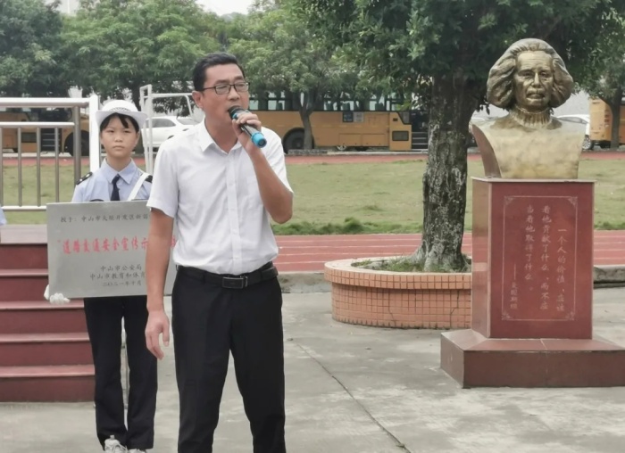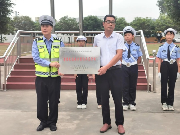 为提升学生的交通安全意识,引导少年儿童树立“知危险会避险,安全文明出行”的正确理念。新苗学校与火炬开发区交警大队联合组建了“校园小交警”站,“小交警”成立后,参与了“夏季攻坚”“头盔风暴”等交通安全宣传活动,在短短的几个月里成果显著,得到了中山市公安局和中山市教体局的肯定,决定授予新苗学校“道路交通安全宣传示范学校”称号。11月3日上午,新苗学校“道路交通安全宣传示范学校”授牌仪式在学校操场举行。此次活动由德育主任黄俊主持。