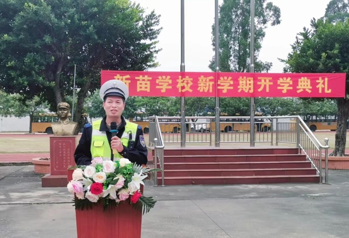 随后,教师代表蒋莹莹老师勉励同学们在新的学期端正态度,养成好习惯,勤奋学习,坚持不懈,在新的学期树新风,启新程。蒋老师倡议全体教师继续以敬业务实的精神开拓进取,恪尽职守,站好每一班岗,不断提高业务水平,实现社会和家长的重托。接着,学生代表郑海媚同学倡议同学们要做有目标、有计划、有行动的新苗学子,满怀热情地投入到学习生活中去,在新学期取得新的成就。最后,火炬开发区交警大队钟警官从生活实际出发,为新苗全体师生带来了一节简短而高效的交通安全教育课。