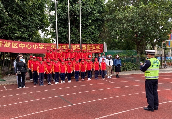为了切实加强学生校内外交通安全教育,提高少年儿童的交通法规意识和自我保护能力,开发区中心小学在中山市公安局和中山市教育和体育局的联合部署下,联合开发区交警大队成立了一支58人的少年交警队。少年交警队的成立是响应教育部关于少年儿童积极参与社会实践活动的践行要求,增强学生的社会责任感和促进学校交通安全工作的深入开展。开发区中心小学通过班主任老师动员及推荐,学生自愿报名,家长大力支持下,于10月25日上午在国旗下举行了少年交警队宣誓仪式,仪式由少先队辅导员于景潇老师主持。