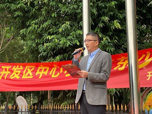 开发区中心小学刘刚毅校长在仪式上进行总结发言,他强调,少年交警队的队员们要利用课余时间,统一着装,在家长的密切配合下,在交警叔叔的专业指导下,学习并宣传交通安全知识,从而达到引导同学、带动家庭、辐射社会的目的。他寄语少年交警队的队员们在日常的训练中,学会自律、自理、自护、自强,从现在开始,从自己做起,认真学习交通法规,刻苦训练本领,做一名遵守交通规则的示范者和维护者!