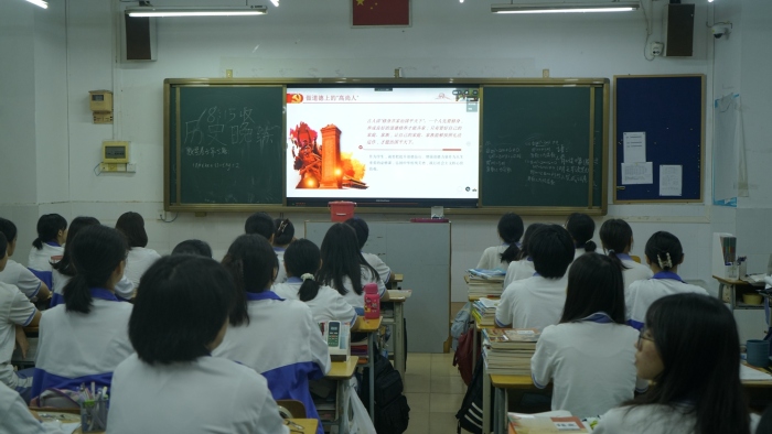 9月1日晚7点,中山市龙山中学党委书记、校长吴明红在校园电视台以“高举旗帜·成就梦想”为主题,为全校师生呈现了一节鼓舞人心、催人奋进的思政课。吴明红表示,在党的二十大即将召开之际,龙山中学全体师生,要感党恩,听党话,跟党走,唱响中国特色社会主义的主旋律,讴歌党的丰功伟绩。