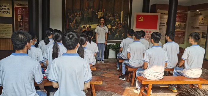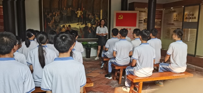 五桂山石莹桥村山明水秀,绿树成荫,曾是中山打击日寇,以少胜多著名战例的发生地。这里,记载着先辈勇担责任,敢于战斗的英勇事迹。研学小组根据规划好的路线,首先参观了珠江纵队司令部旧址,也称古氏宗祠,通过观览一幅幅图片、一张张旧物,一段段视频,了解了英勇的中山人民在中国共产党领导下所开展抗日斗争的英雄事迹,感受着他们的顽强不屈和坚定意志。在这蕴含着红色基因的基地,同学们在莫宗迪主任的带领下,重温了入团誓词;党办主任暨课程建设组主持人马立华老师为大家详细讲解了当年中山的红色故事;梁天钧级长带领同学们激情朗诵了王昌龄《出塞二首·其一》和李清照的《夏日绝句》古诗词,同学们的爱国之情油然而生。而后,梁业兴和刘金蓉级长为学生们分别从数学、地理的角度分析当年中山五桂山人民抗战时的所运用的知识,引导同学们感受中山人民的智慧,立志更努力学习科学文化知识,将来真正为祖国各项伟大事业添砖加瓦。最后皮益辉级长暨课程建设组成员呼吁同学们赓续红色文化,弘扬民族精神,争做先锋模范,积极向党组织靠拢,争取将来早日加入中国共产党,为共产主义事业,为中华民族伟大复兴而奋斗。