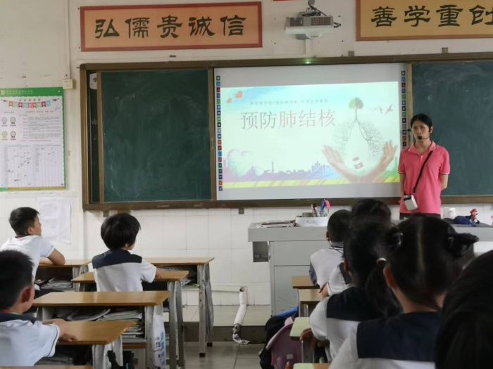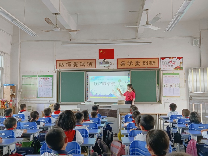 在班会课上,班主任先是通过播放宣传预防肺结核病的动漫短片,直观、生动地给学生呈现了肺结核病的传播源以及预防方法。以生动活泼的形式把枯燥的传染病知识表述得通俗易懂,给学生留下了深刻的印象。接着,利用幻灯片给学生详细讲解了肺结核病的有关知识,让学生知道:结核病是一种古老疾病,人类与结核的斗争史至少有两千多年;结核病菌从未被消灭,至今还在全世界广泛传播。结核病是全球性公共卫生问题,是导致死亡人数最多的全球头号传染病杀手等 。最后班主任们讲解了预防肺结核病的主要方法,比如要注意经常通风,保持空气流通;要养成良好个人卫生习惯,不随地吐痰,咳嗽、打喷嚏时掩住口鼻,常洗澡、勤换衣被等;要加强体育锻炼,增强体质;要定期进行健康体检,发现异常及时诊治等。