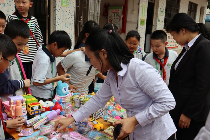 活动前,各中队提前将各班别具一格的宣传海报、琳琅满目的商品---学习用品、毛绒玩具以及家长爱心捐赠的新衣服和新电风扇等。还对自己班的“店铺”合理的配备了保管员、售货员、促销员等相关“工作人员”。