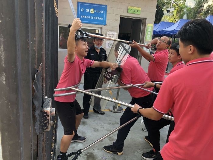 为有效预防、及时控制和消除校园重大突发事件的危害,保障师生身体健康与生命安全,维护学校正常的教育教学秩序,全面提高应对恐怖和暴力能力。中山市民众新徽学校于2021年9月10日上午组织应急防暴组人员开展安全防暴反恐模拟演练活动。
