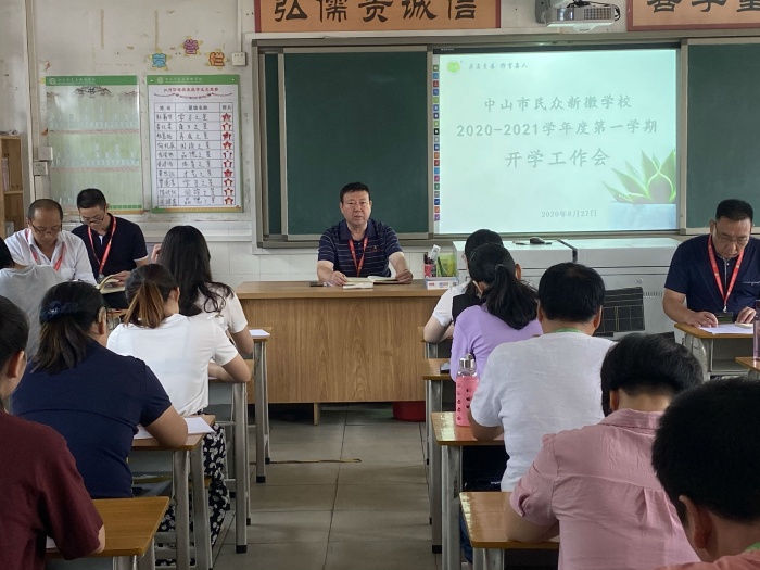 最后,刘品江校长传达了集团全体行管工作会、中山市教体局以及民众镇教育事务指导中心工作会议的精神,并对新学期的开学工作要求及工作设想。刘校长强调,全体教师要做好疫情的防控工作,也要对学生及家长做好开学前的疫情防控教育工作;师德师风、班风学风的建设作了要求;关心和爱护学生,关注每一位学生的心理健康。