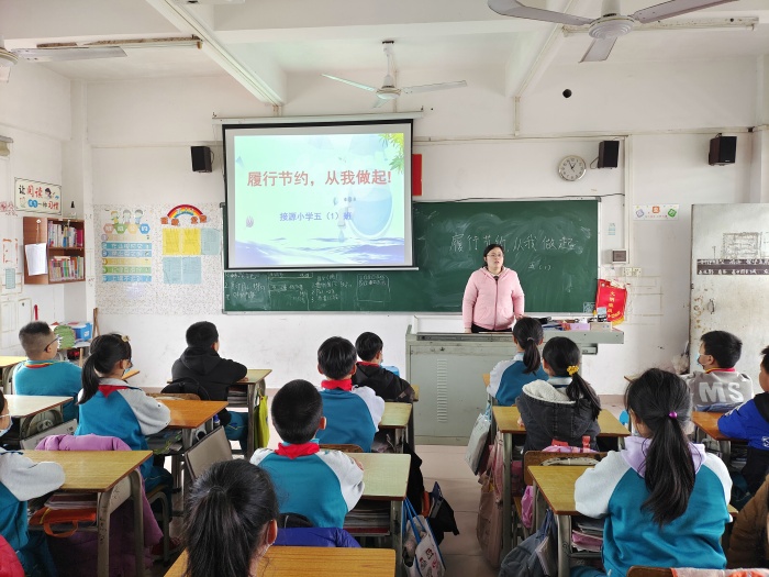 主题班会上,接源小学的同学们表现踊跃。首先,同学们列举了学习、生活等方面的种种浪费现象;然后,交流讨论改掉坏习惯的金点子,节约的小妙招,个别同学推广自己的节约小发明;接着,在班主任的主持下的进行勤俭节约的问答竞赛,普及节约知识,引导学生争做勤俭节约的小先锋,还让个别学生讲名人名家的勤俭故事等让同学们认识到了勤俭节约的重要性,牢固树立“节约光荣、浪费可耻”的观点;最后全体同学发出倡议,号召大家身体力行,从我做起,从点滴做起,开展节水省电、爱惜粮食、节约学习用品等活动,践行勤俭节约的美德。