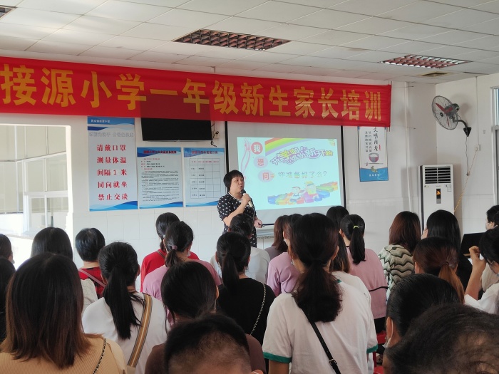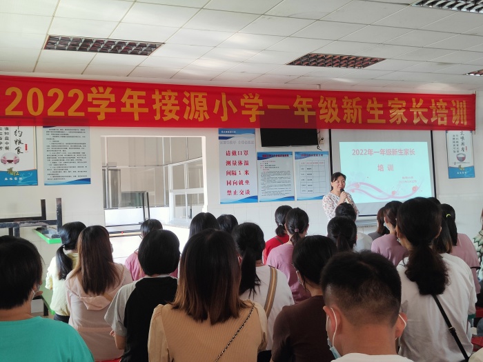别过夏花绚烂,走进秋叶静美,在这美好的季节里,接源小学又迎来了一年级的新生。为了使一年级新生初步了解自己的新学校,尽快适应小学生活,同时也让新生家长了解学校教学理念和管理措施,搭建有效的家校沟通平台,促进学校与家庭形成教育合力。经过精心筹备,接源小学于2022年8月28日上午成功举办了一年级新生及家长见面会。