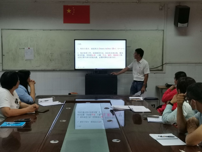 教导处杨顺球主任首先对2021-2022学年度下学期期末检测中各年级各学科成绩进行了具体系统的分析。在分析中用具体的数据说话,通过对各年级各科合格率、优秀率、年级平均分跟本班上学期成绩的对比,跟镇的平均数据进行对比评价和分析,真实呈现了各年级各学科期末考评结果,让老师们明确现状,看到成绩和差距。针对各科存在的问题提出了今后的教学建议和改进措施,要求做到以下几点:一、明确目标,树立目标意识。二、要抓常规、抓纪律,常规要落实到位。三、要培优辅差,抓学习细节。接着杨顺球主任生动形象地介绍了“家”字的由来,“家”字的意义,勉励大家要以校为家群策群力提升教学质量。