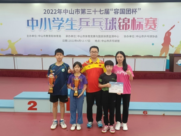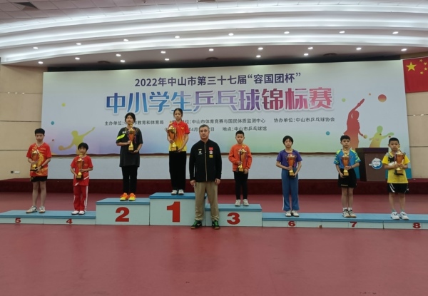 由中山市教育和体育局主办,中山市体育竞赛与国民体质监测中心承办,中山市乒乓球协会协办的2022年中山市第三十七届“容国团杯”中小学生乒乓球锦标赛于2022年4月12日—17日在中山市乒乓球馆举行。锦标学校乒乓球队在本次比赛中再创佳绩,分别荣获小学组团体总分第六名、初中组团体总分第八名的好成绩。