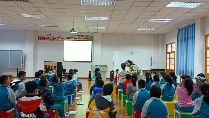 本次教研课由三民学校谭琼老师执教,内容为一年级上册第七课《法国号》。课堂上,谭老师通过生动的语言,巧妙的设计,步步的引导以及巧妙的运用柯达伊教学法,不仅使学生能准确的演唱歌曲还能很好的掌握三拍子的强弱规律并能听辨小节数和拍号等能力。谭老师循循善诱,学生学得津津有味。