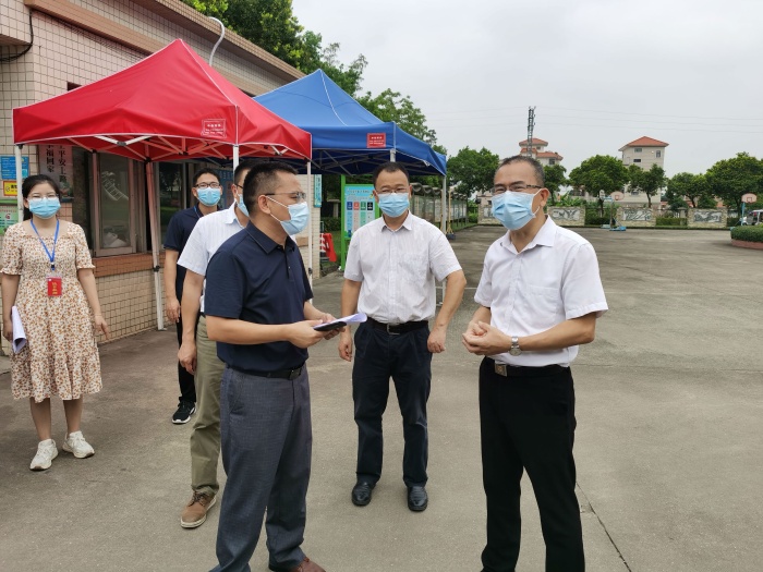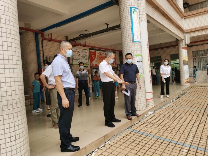 黄声群主任一进校门就详细询问了学校开学疫情防控的相关情况。胡留全校长把教职员工、学生及同住人粤康码、行程卡和智立方申报表收集情况,校门口值日及测温安排,应急处理流程等向黄声群主任作了汇报。