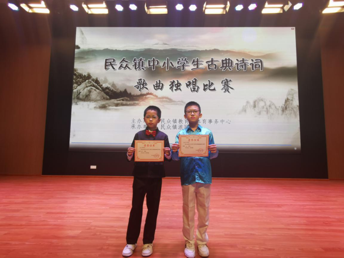 三民学校六5班的陆观富同学和六2班赵志涛同学在本次比赛中表现优秀,分别获得了第一名和第二名的好成绩。可见,赛前同学们都秉着“艺术魅力,炫我风采”的态度做好了精心的准备。决赛现场选手们自信满满地走上舞台中央,用或甜美、或轻柔、或昂扬的歌声演绎着古典诗词的博大精深,他们美妙的歌声令在场的观众产生共鸣,大家徜徉在诗词与音乐的海洋中,大大的激发了对古诗词的兴趣,这无一不展现我镇学生奋发向上、朝气蓬勃的正气,以及同学们积极向上的精神风貌。
