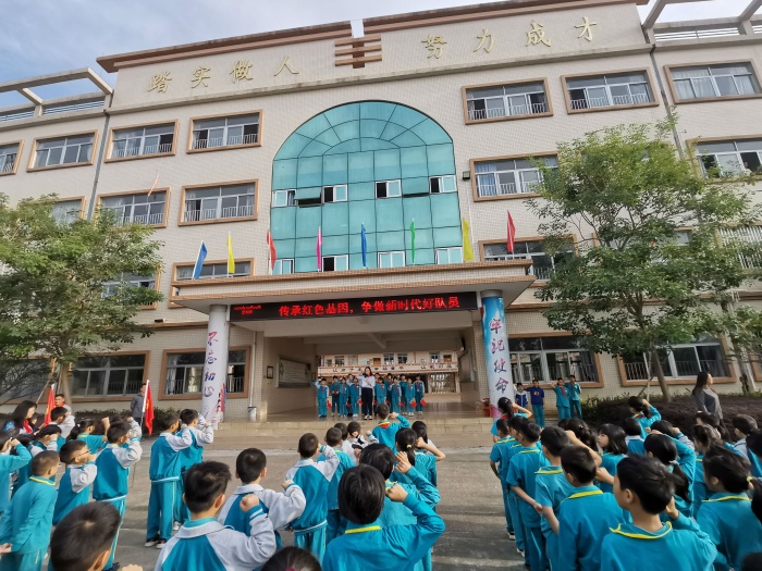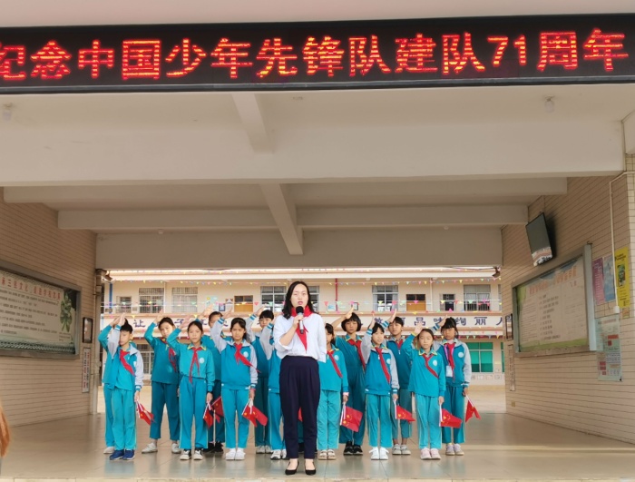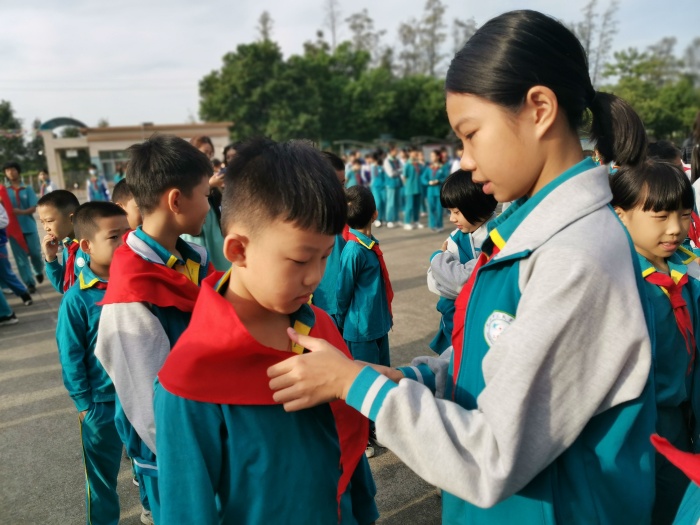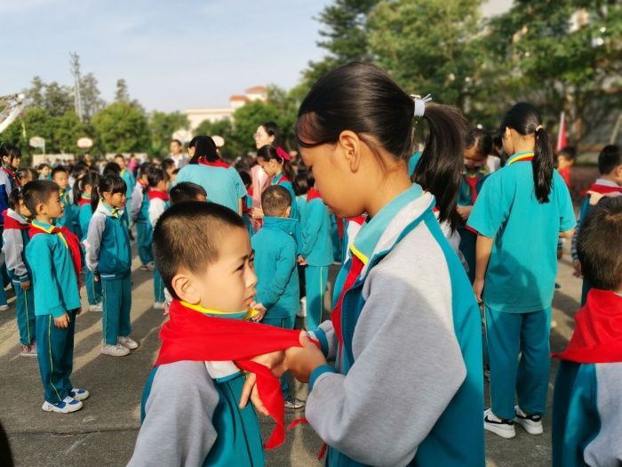 决定宣布之后,老队员们为新少先队队员佩戴了鲜艳的红领巾。大堂前,全体少先队员们在鲜艳的队旗下庄严宣誓:“时刻准备着”,表明为共产主义事业贡献力量的决心。最后,三民学校少工委主任林西仙校长表达了对新队员真诚的祝福和对全体少先队员们殷切的希望。