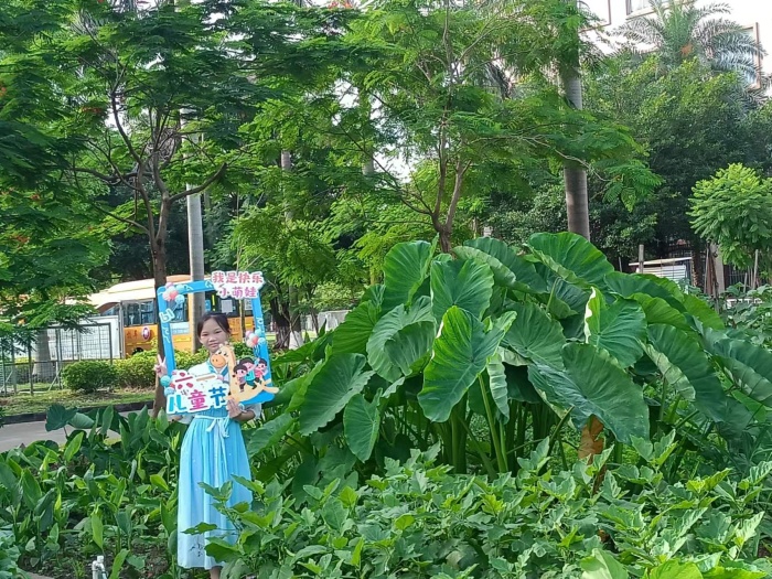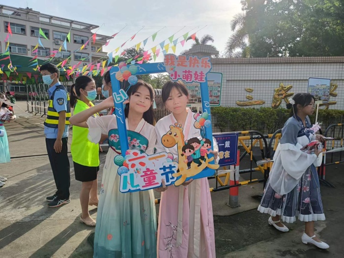 早上7点,少先队员身穿汉服手举精美拍照相框在校门口送欢乐,让学生进入校园的这一刻就能感受到欢乐轻松的“六一”氛围。