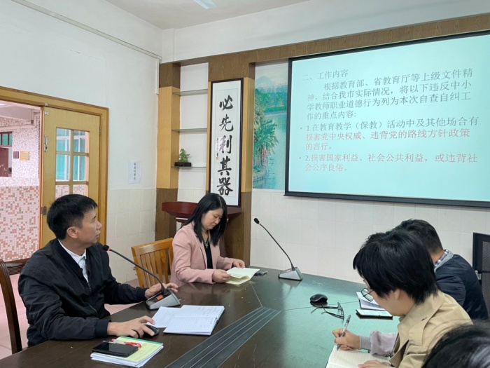 本次主题会,首先由陆锐勋校长组织学习《中山市教育和体育局关于开展师德师风自查自纠工作的通知》。接着,德育处陈福有主任就《新时代中小学教师职业行为十项准则》《广东省中小学幼儿园教师违反职业道德行为处理工作指引》的一些纲要进行了组织学习。最后,支部书记陆锐勋同志特别强调,意识形态是学校工作的重要组成部分,教师们应该以身作则,在政治上要与党中央保持一致,在生活中要传递正能量,在工作中要不忘初心的为社会主义建设培养人才。