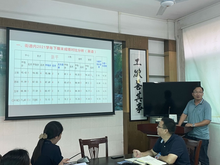 然后,英语科组长吴照辉老师对英语科组近三年的整体成绩进行简要的分析,他指出近三年新平小学三、五、六年级英语成绩较好,平均分排位居本镇前列,四年级成绩中等偏下,针对此情况,英语科组制定出具体的改进措施,并且提醒科组老师相互借鉴方法、分享资源 ,特别在加大培优辅差的力度、关注学困生等方面进行剖析。