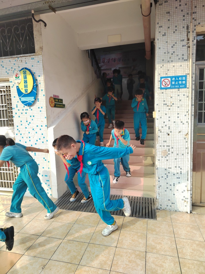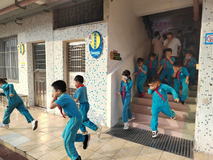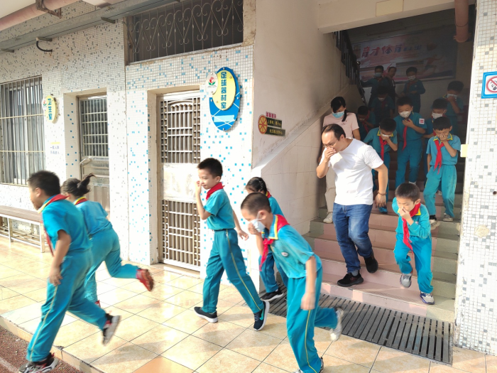 下午三点五十分,警报铃声的响起把育才小学这次消防应急疏散演练拉开了序幕。工作人员各就各位,场地集结队列指挥人员快速到达操场,楼层疏散指挥快速到达相应楼层,班主任快速到达班级,指挥全体学生立即起立,走前门的面向前,走后门的面向后,依次撤离至教室外,按指定路线快速疏散。你看,同学们一个个猫着腰,用手、袖口、湿巾等捂着嘴鼻迅速有序地进行紧急疏散。学生到达指定的安全位置后,为了确保全体学生安全疏散完毕,班长随即清点人数后,向班主任汇报,班主任及时汇报给年级组长,年级组长报告给总指挥。整个演练井然有序,没有奔跑冲撞,没有推拉喧哗、拥挤踩踏。整个疏散过程不到2分钟。