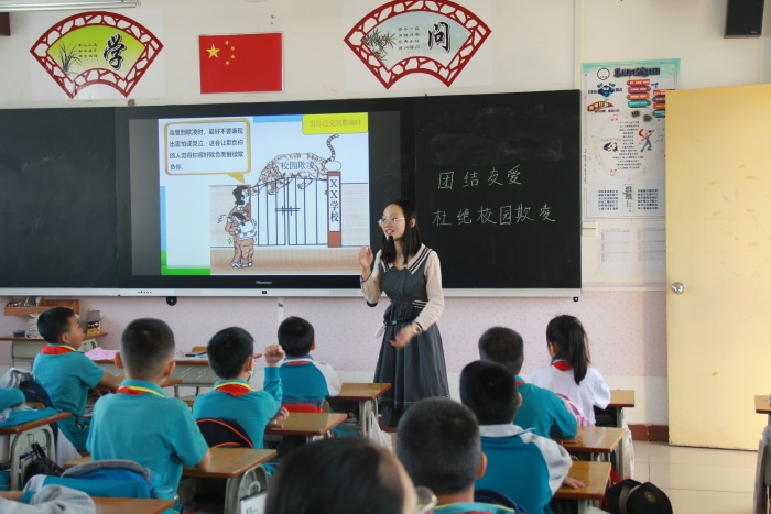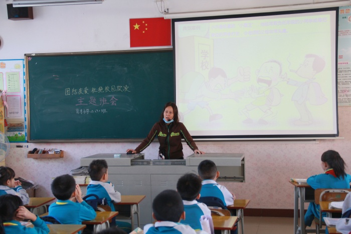 2020年 11月9日,育才小学马超龙老师利用国旗下讲话时间,结合了学校和学生的实际讲述了校园暴力的危害性。他强调,不管是言语上还是身体上的攻击,都是校园欺凌、校园暴力行为。在校园暴力欺凌发生的时候,同学们要临危不乱,及时报告,以法维权。接着,育才小学各班开展了以“团结友爱,杜绝校园欺凌”为主题的班队会,活动中,老师运用生动详实的案例给同学们深入浅出的分析了校园欺凌的危害,引导学生在校园暴力欺凌发生的时候该如何抵制?学会保护自己,应对暴力,临危不乱,及时报告,以法维权。最后号召大家:反校园欺凌和暴力,一定要做到学法、懂法、守法。要从小事做起,从现在做起。立志做文明少年,远离校园欺凌。