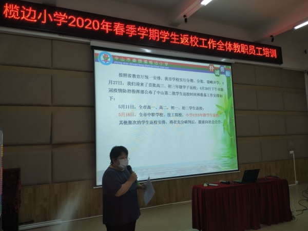 为切实做好新冠肺炎疫情防控工作,提高应对新冠肺炎疫情的快速处置能力,确保“安全、平稳、有序”返校复学,南朗镇榄边小学于5月8日下午,在榄边小学阶梯室召开了2020年春季学期返校复学全体教职员工防疫培训会。