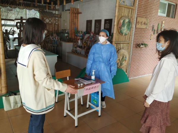 学校大门是校园疫情防控的第一道防线。学校在校门口设置三条检测通道,学生戴好口罩按前后间隔1米排好队,由值日教师测量体温,体温正常方可入校。若发现有体温高于37.3°C,立刻由值日教师带至隔离观察区,第一时间告知值日行政、校医。值日行政通知班主任,班主任致电家长了解具体情况。校医询问是否有疫区接触史或聚集发病等情况,做好记录,并向学校防疫领导小组汇报,分管副校长上报教育主管部门和疾控部门,安排学生就医,并做好学生情况追踪工作。