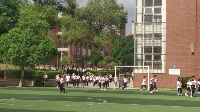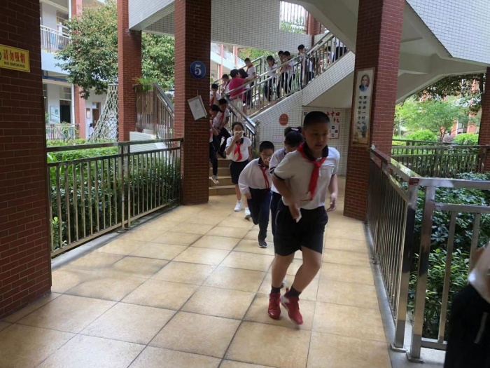 上午9:10,随着警报的响起,班主任老师迅速到达班级,协助上课老师一起组织学生疏散,其他老师们也在第一时间赶到自己当时所在楼层拐角、人流比较多的地方,配合疏散学生。各班学生在老师们的指挥下,按照指定路线,弯着腰,用手、纸巾捂着嘴鼻迅速有序地进行紧急疏散。全体师生撤离到安全地带,用时不到三分钟。