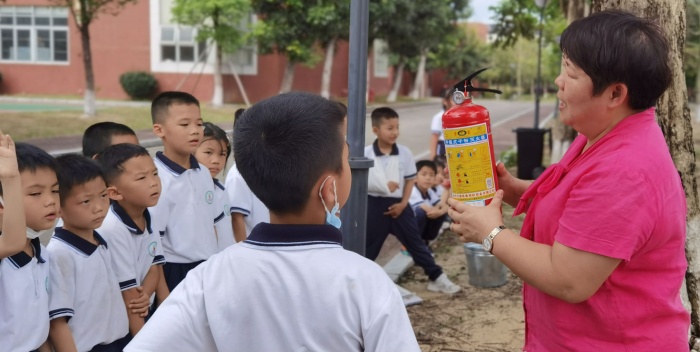 之后袁少平校长对演练情况进行总结,对同学们在应急演练中听从指挥、反应迅速进行了表扬,希望同学们在今后每月一次的演练中表现得更好。接着学校组织了一年级小朋友到侨心林进行灭火器的使用演示。袁少平校长、吴振发主任、李洪静主任现场讲解了灭火器的使用方法,向孩子们演示了如何使用灭火器,并邀请小朋友上场实操,整个过程学生学有所得。