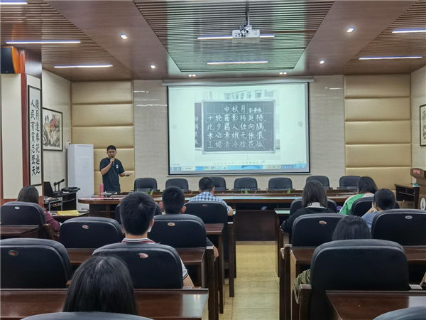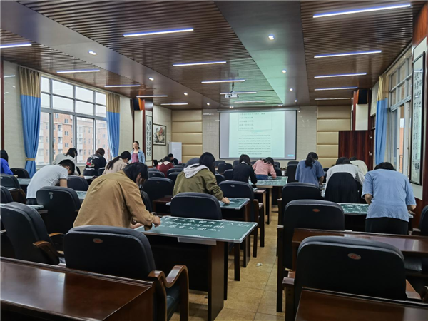 比赛只是手段,以赛促学、促研才是目的。为了让参赛教师有更多收获,美术兼书法专业教师蒲丹华做了一个小讲座,他展示自己曾经参赛的作品,提供一些优秀参赛作品,强调把握字的结构很重要,提醒大家要注意左右两部分的宽窄大小,处理好主次关系等。易思副校长让老师们重温了单永辉老师指导的“横笔长,竖笔短”书写技巧,希望老师们学以致用。其他评委也分别从行距、字距、用笔、笔画等方面做了指导。