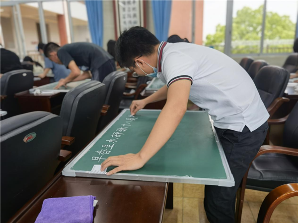 当天下午5:00,青年教师们先到教辅室选取一张小黑板,再到教师会议室做好赛前准备。5:20-5:25是正式比赛时间,魏主任摁下比赛铃声,全体参赛教师弯腰专心挥洒自己的粉笔字,向规范、端正、美观、快捷的目标奋进,五分钟时间很短,真正的比赛体验让老师们深切感受到要与时间赛跑。比赛一结束,老师们只得放下粉笔,离开比赛场地。接下来就是评委评审时间,为了能在比较中公正评审,评委们把一张张小黑板移放到墙边,在共同商议和交流中选出一等奖四名,二等奖五名,三等奖九名。