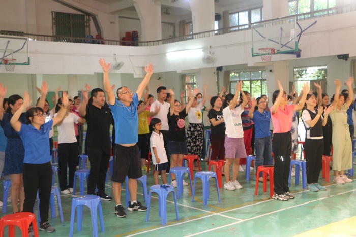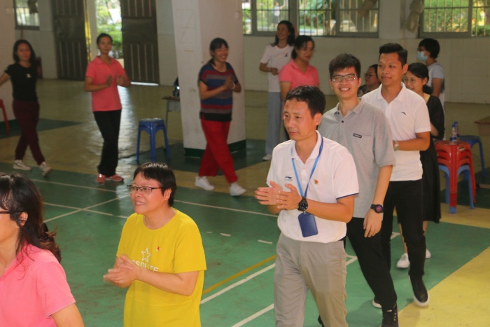 听着欢快的音乐,全体工会会员来到学校的礼堂坐好,主持人周家昌老师走上舞台宣布活动开始。活动的第一个环节是全体行政领着教职工们做“葛吉夫拍手操”。这是一个训练专注力和耐心的拍手操,也是一个很好的放松活动。开学一个月,教职工们忙忙碌碌,身心疲惫,这个操让大家身心放松。在行政领导们的带领下,全体教职工整齐欢快的做着拍手操。